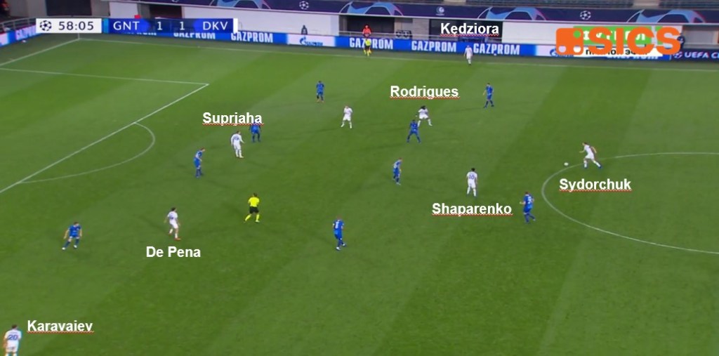 In fase di non possesso, nelle due sfide del preliminare contro i belgi del Gent la formazione ucraina ha dimostrato di saper alternare fasi di difesa posizionale bassa con due linee di quattro ad altre di pressing avanzato (il PPDA degli ucraini nel doppio confronto ha registrato un dato di 8.61 all’andata e di 9.58 al ritorno). Anche nel primo caso l’idea è comunque di non schiacciare troppo la linea arretrata e di stringere sul lato forte, chiudendo i corridoi centrali.