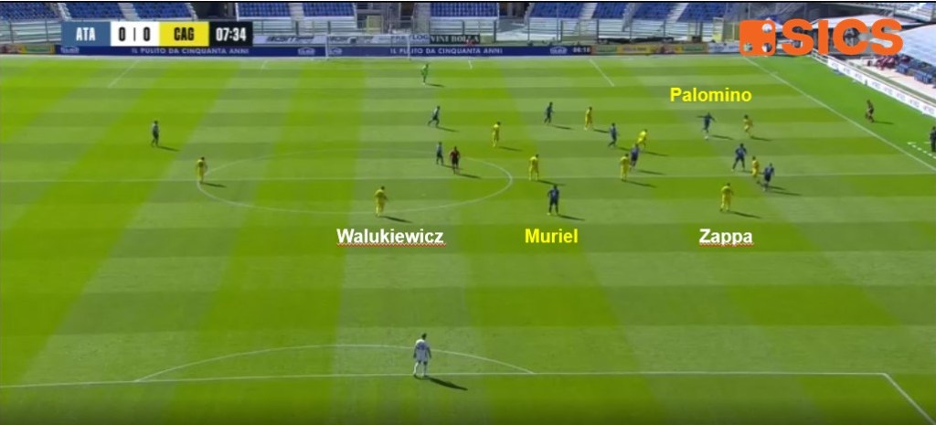 Infine, in occasione del terzo gol, vediamo il movimento di Zapata nel mezzospazio sinistro che finisce per dilatare le distanze fra i due centrali difensivi cagliaritani A questo si aggiunge il bel movimento di Pašalić che va a ricevere il passaggio chiave di Gómez in zona di rifinitura.