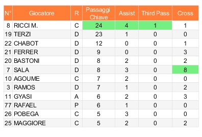 Non a caso sono proprio i centrali difensivi ed il vertice basso del centrocampo i giocatori ad aver effettuato il maggior numero di passaggi chiave dell’intera squadra.
