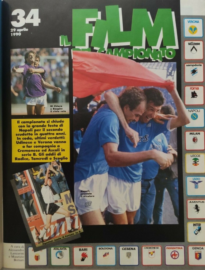 Eccoci al fatidico 8 aprile quello della monetina di Alemão. Ma è soprattutto il Milan a buttare via lo scudetto, crollando a Verona alla penultima. Il Napoli invece vince a Bologna con un gol di Diego e sorpassa i rossoneri. La vittoria all’ultima giornata sulla Lazio consegna il titolo al Napoli. Il Maradona festante, che negli spogliatoi si sostituisce a Galeazzi, è stato forse l’ultimo Diego felice in versione napoletana.