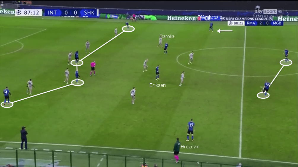 In queste situazioni non era più l’Inter a dettare il contesto tattico ma i rivali, col risultato per i nerazzurri di doversi affidare a soluzioni alternative. A inizio stagione una di queste era rappresentata da Hakimi. Arrivato in estate per alzare il livello qualitativo degli esterni a disposizione, l’ex Borussia Dortmund si è velocemente imposto come un quinto offensivo in grado proprio di garantire alla squadra di Conte una alternativa in grado di occupare in modo più efficace la zona di ampiezza che, a quel punto, poteva aggiungersi al centro (dove stazionano i due attaccanti stretti) come zona di potenziale pericolo per gli avversari.