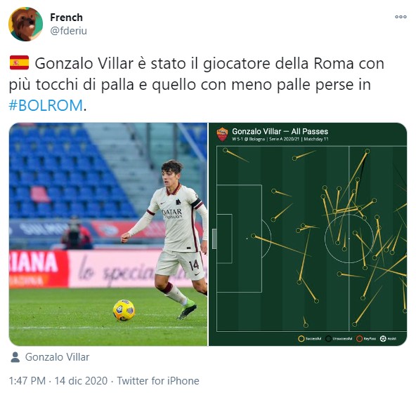 E proprio in fase di sviluppo si sta rivelando quanto mai utile l’apporto di Villar, elemento coerente col progetto tecnico impostato dal tecnico e dal suo staff. Il 22enne di Murcia è infatti un giocatore di possesso, abile nel fraseggio e come tale è stato utilizzato da Fonseca per dare ulteriore fluidità alla manovra giallorossa.