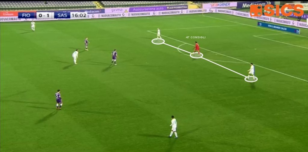 In questo senso, l’atteggiamento dei viola ha pagato. Infatti, è vero che gli uomini di De Zerbi, quando sono riusciti a trovare linee di passaggio verticali, sono diventati pericolosi riuscendo a sfruttare la loro qualità (come in occasione del gol del vantaggio) ma, in generale, il Sassuolo ha avuto difficoltà nel trovare la profondità e spesso il suo palleggio è stato a U.