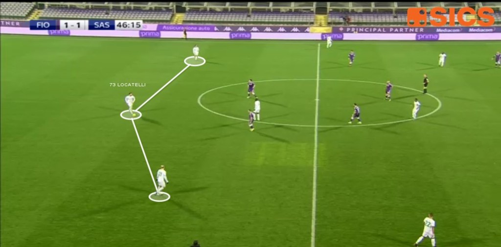 O, ancora, in zone più avanzate, la salida lavolpiana di Locatelli, richiamato da De Zerbi per scendere in mezzo ai difensori centrali.