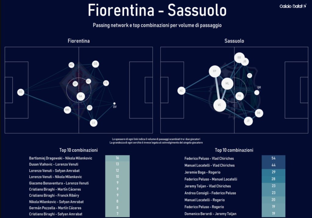 Per quanto riguarda invece la squadra di Prandelli, come detto la prestazione offensiva è stata ancora una volta poco brillante. I viola hanno tirato più del Sassuolo (14 conclusioni contro 10) e hanno avuto più calci piazzati a disposizione (8 contro 2) ma hanno prodotto meno in termini di non penalty expected goals (0.96 npxG rispetto agli 1.71 degli ospiti).