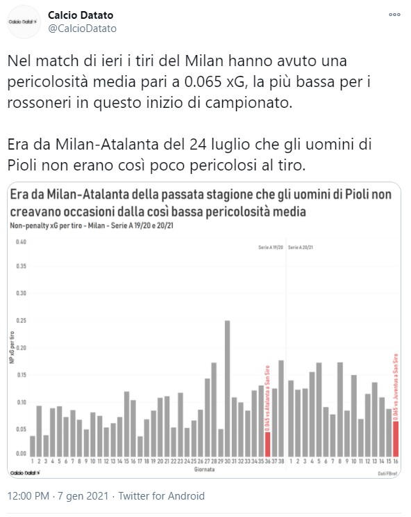 In termini di expected goals infatti la prova rossonera è stata alquanto deficitaria e questo non in senso assoluto quanto invece se andiamo a rapportare il dato prodotto per le conclusioni prodotte.