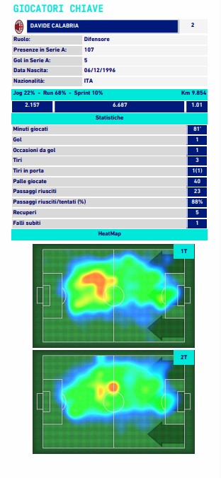 Ma la discreta partita di Calabria si è vista, come detto in apertura, anche quando il Milan si è trovato a gestire il pallone. Non a caso il no.2 di Pioli è risultato essere il secondo giocatore rossonero (e il secondo in assoluto) per passaggi chiave effettuati.