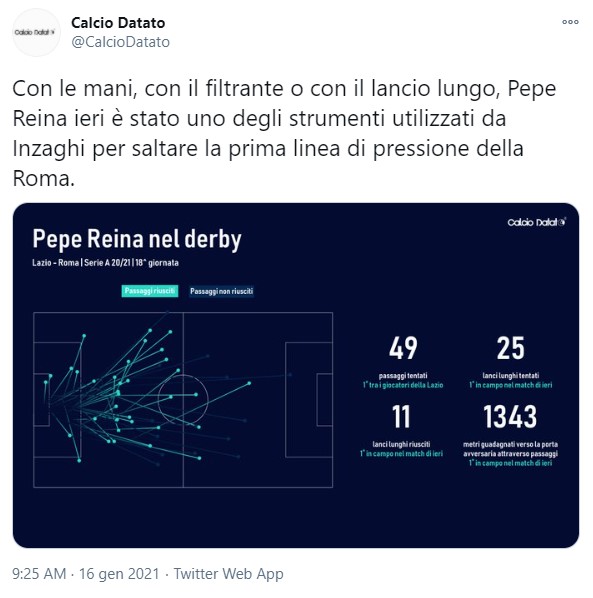 Alla fine il successo della Lazio è stato meritato. Osservando i numeri notiamo come la Lazio abbia tirato di più della Roma (9 conclusioni nello specchio contro una sola da parte dei giallorossi), con una percentuale realizzativa di ben il 33%.