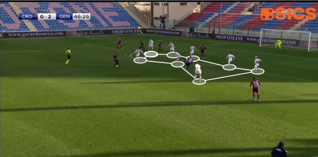 Dell’arretramento del serbo ha beneficiato tutta la fase difensiva, con un sensibile calo dei gol subiti: con il Crotone il Genoa ha registrato il quarto clean sheet consecutivo. Ovviamente, accanto a questa mossa c’è dell’altro, come ad esempio l’utilizzo di elementi di esperienza e qualità nel settore mediano (dove è arrivato come rinforzo Strootman) e, in generale, l’utilizzo di una fase difensiva volta a negare la profondità alle spalle della propria linea difensiva, anche a costo di abbassare la prima linea di pressione (il Genoa di Ballardini è terzultimo in campionato in termini di PPDA con un dato di 13.99) e orientata al tentativo di sporcare le linee di passaggio agli avversari, negando loro la zona di rifinitura.