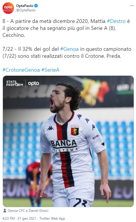 Nel gennaio seguente l’approdo al Milan: in maglia rossonera il contributo di Destro sarà di 3 gol in 15 partite. Poi gli anni di Bologna, col picco del 2016/17 (11 gol). Nelle ultime tre annate solo 4 reti e una manciata di presenza fra felsinei e Genoa, dove appunto è tornato quest’anno.