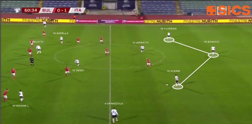 Davanti ai tre difensori viene a costituirsi una coppia di play che hanno il compito di aiutare l’uscita palla da dietro e di veicolare i flussi di gioco sfruttando le linee di passaggio che gli Azzurri costruiscono in fase offensiva. In questo senso il 4-3-3 di partenza si sviluppava in un 3-2/4-1 con una delle mezzali (Pessina, Barella e Pellegrini) che andava a giocare in zona di rifinitura a supporto dell’esterno sinistro (Insigne ed El Shaarawy) e dietro la prima punta.