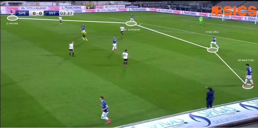 Così facendo, Conte ha aggiunto un ulteriore elemento in fase di costruzione del quale gli avversari dovevano occuparsi (insieme al croato e a Bastoni) nel quadro di quello sviluppo 4-2-4 di cui sopra che vedeva Barella accoppiarsi con Hakimi per creare un corridoio destro funzionale alla risalita del campo.