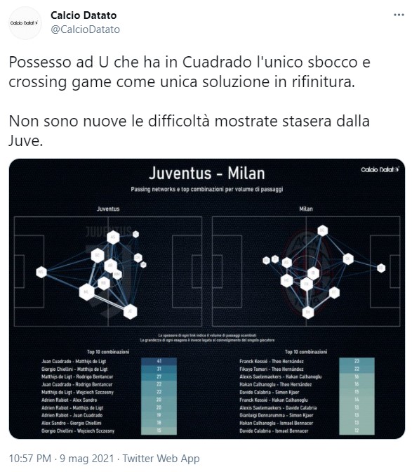 Un dato, quello sopracitato della squadra di Pioli, comunque superiore rispetto all’1.10 registrato dalla Juve. La squadra di Pirlo ha confermato ancora una volta le proprie difficoltà nell’invadere la zona di rifinitura e nell’attaccare l’ultima linea difensiva avversaria.
