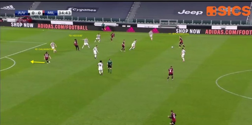 Coerentemente con il proprio modello di gioco (peraltro difficile da modificare per ogni squadra, a poche partite dalla fine della stagione) Stefano Pioli ha scelto di andare ad invadere lo spazio alle spalle della coppia di mediani bianconeri (Rabiot e Bentancur), affidandosi non soltanto agli ormai classici movimenti a uscire di Ibrahimovic ma anche alla presenza di due trequartisti come Calhanoglu e Brahim Díaz.