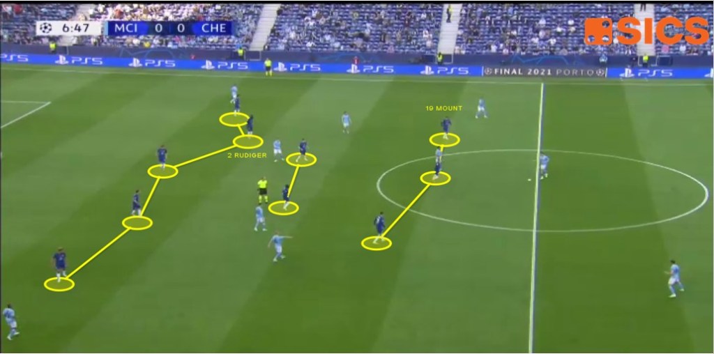 Proprio questi tre giocatori sono stati fondamentali alla tattica predisposta da Tuchel: il 22enne inglese (utilizzato come mezzala di possesso in fase offensiva e come supporto alla prima linea di pressione nel 5-2-3 col quale i Blues si disponevano in fase difensiva) trovava ai lati di Gündogan quello spazio e tempo di giocata che veniva favorito dalle corse in avanti dei due attaccanti del Chelsea, che andavano ad allungare il City durante la fase difensiva della squadra di Guardiola.