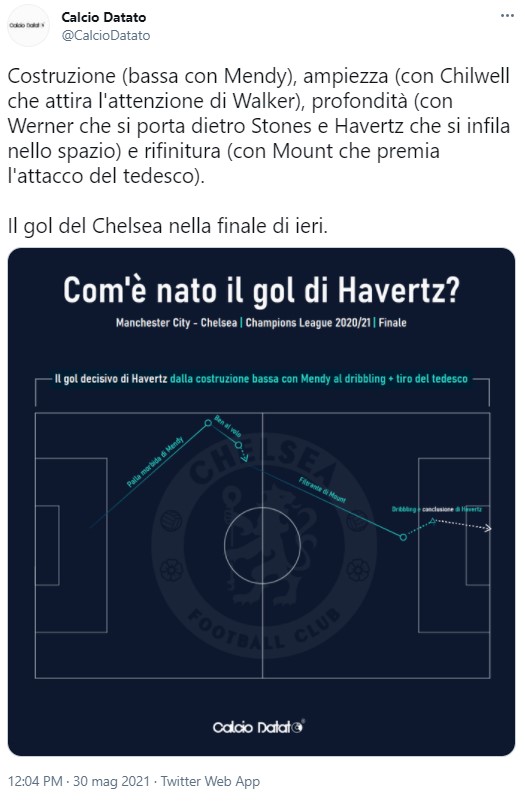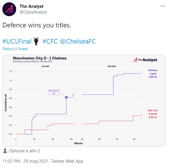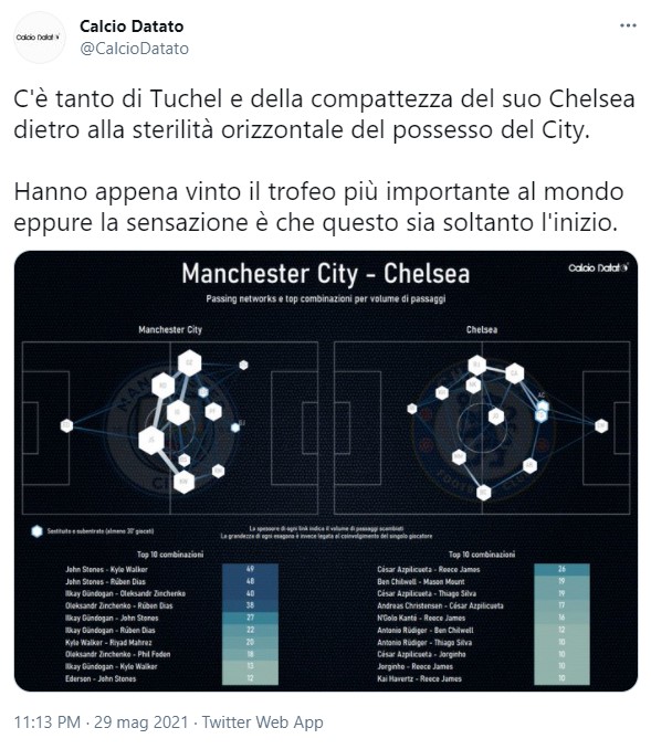 Alla fine dunque la partita premia un Tuchel che ha vinto nettamente il confronto tattico con il suo dirimpettaio, proponendo un Chelsea in grado di annullare i punti di forza del City e di sfruttarne i deboli. Non male per chi aveva ereditato un Chelsea in difficoltà sotto la precedente gestione tecnica.