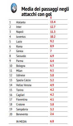 In generale comunque, pur avendo proposto nelle ultime stagioni una versione di se stessa più incline al palleggio (con sovraccarico del lato sinistro del campo), la Lazio del campionato appena finito è risultata essere una squadra più diretta dell’Inter, avendo registrato una media dei passaggi negli attacchi conclusi con una rete realizzata inferiore rispetto a quella dei nerazzurri.