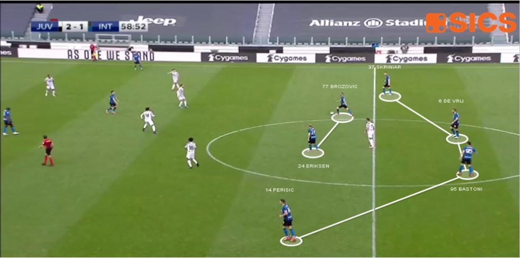 Negli ultimi tempi poi, Conte ha accentuato una costruzione a quattro per andare successivamente a sviluppare 4-2-4 in fase di risalita, cercando di sfruttare soprattutto la coppia Barella – Hakimi che andava a crearsi sul lato destro del campo.