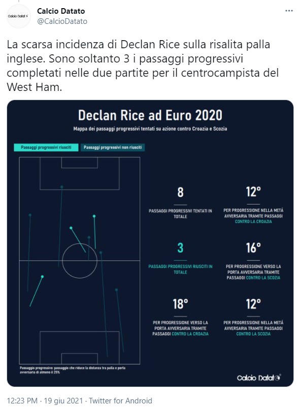 Un posizionamento che ha dato particolarmente fastidio all’Inghilterra, con Rice ed i centrali difensivi che non riuscivano a gestire l’attaccante del Southampton, tanto è vero che Adams ha ricevuto ben 7 passaggi chiave dai compagni.