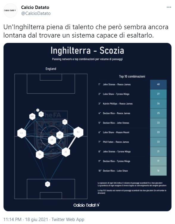Alla fine anzi gli scozzesi possono recriminare per alcune buone occasioni avute, pur avendo generato un dato di appena 0.7 in termini di expected goals. Dato che, sommato a quanto prodotto nella prima partita contro la Rep. Ceca, porta il totale della squadra a 2.65. Nonostante questa buona produzione in avanti, dopo 180 minuti di questi Europei la Scozia non ha ancora segnato una rete, confermando i limiti offensivi che si conoscevano.