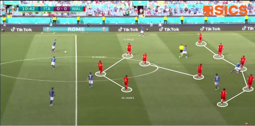 Questi principi di gioco sono rimasti costanti anche nella sfida contro l’Italia, per la quale il tecnico britannico è tornato al più abituale 5-2-3 con lo stesso James, Ramsey e Bale davanti. L’idea era quella di favorire ulteriormente la chiusura dei canali centrali attraverso la copertura dei tre riferimenti offensivi e dei due mediani e, allo stesso tempo, di occupare tutti i corridoi verticali con almeno un uomo.