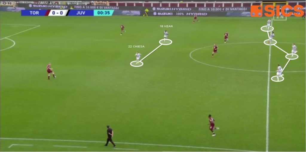 Nel primo tempo, con la Juve che operava con un baricentro basso (41.99m) la compagine bianconera ha fatto fatica a servire l’ex viola, non riuscendo quindi a sfruttare il campo aperto venutosi a creare. Proprio la risalita del campo in transizione è uno dei punti di forza di Chiesa.