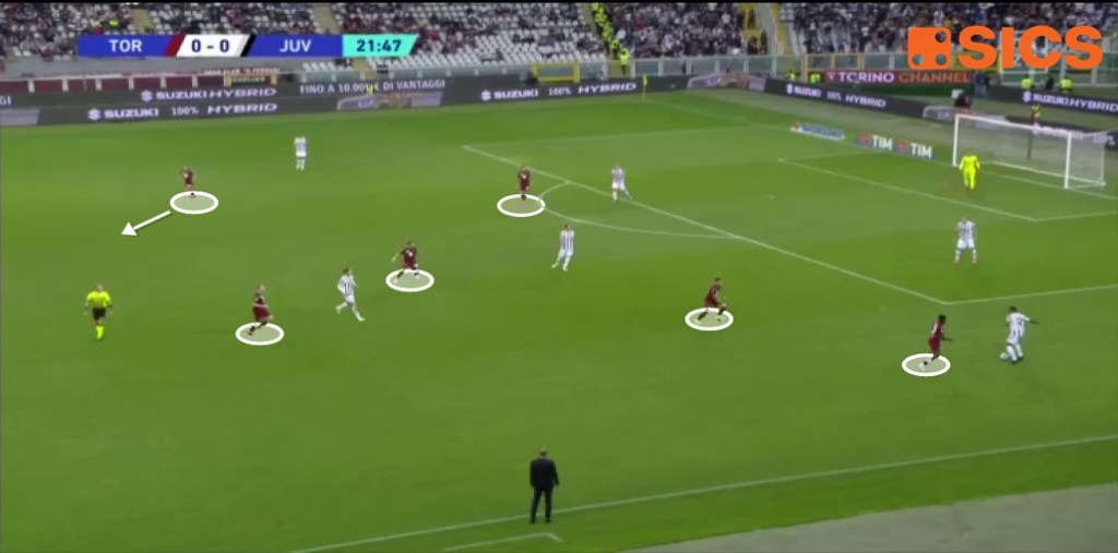 In questa immagine tratta dal Derby della Mole vediamo come la squadra granata vada a pressare orientata sull’uomo sul lato forte mentre il giocatore collocato sul lato opposto si muove per accorciare e riequilibrare così l’assetto difensivo della sua squadra.