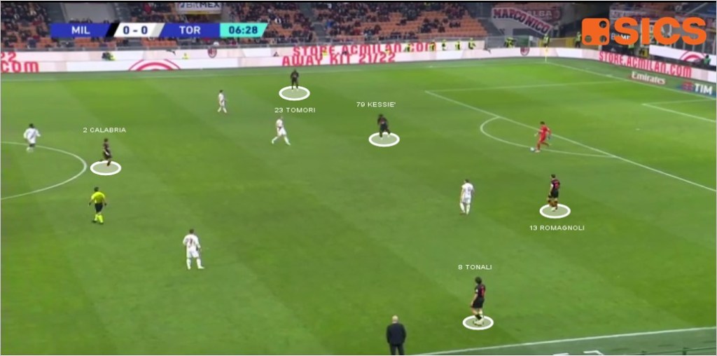 Contro il Torino si è visto anche Tonali allargarsi a sinistra in alcune occasioni, con Kalulu (schierato da terzino sinistro) che guadagnava campo in avanti.