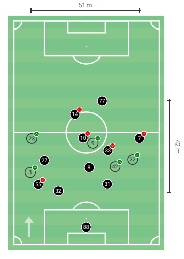 In fase difensiva invece il Venezia tende ad abbassarsi per compattare le linee, negare la profondità agli avversari e creare campo alle spalle della retroguardia rivale da colpire poi in contropiede. Il dato del PPDA della squadra veneta (14.4) è infatti il terzultimo del torneo (più basso solo del 16.4 di Udinese e Cagliari) mentre il baricentro medio sul possesso avversario è di 44.25m.