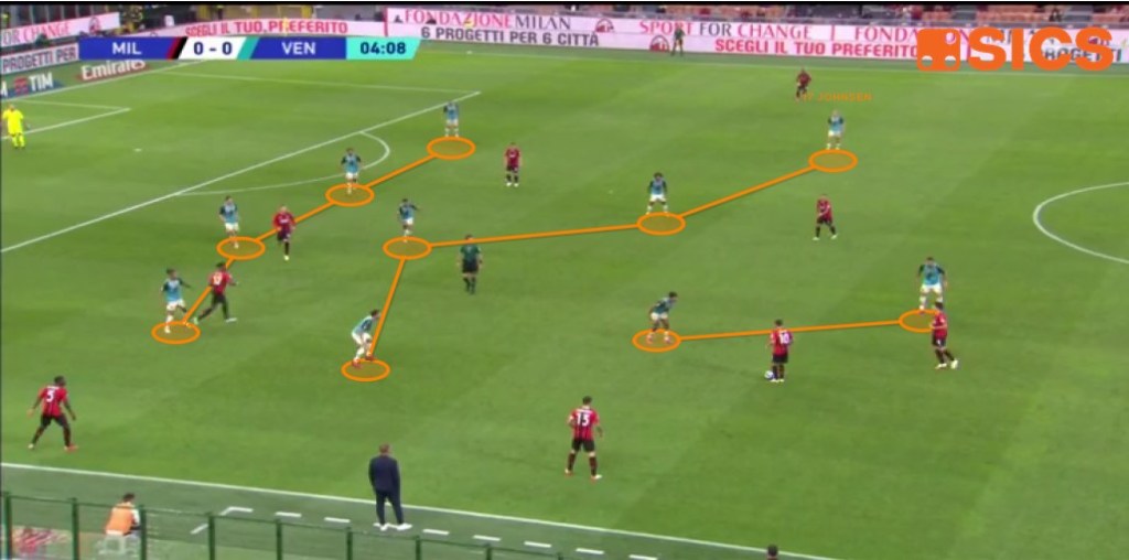 Con palla agli avversari, la squadra cerca di fare densità centrale, chiudendo la zona di rifinitura. Il corretto funzionamento di questo atteggiamento che mira a serrare le linee è confermato dal numero di passaggi chiave subiti dal Venezia. Il totale infatti (294) è superiore soltanto a quelli concessi da Juventus, Atalanta, Bologna, Inter Fiorentina e Roma.