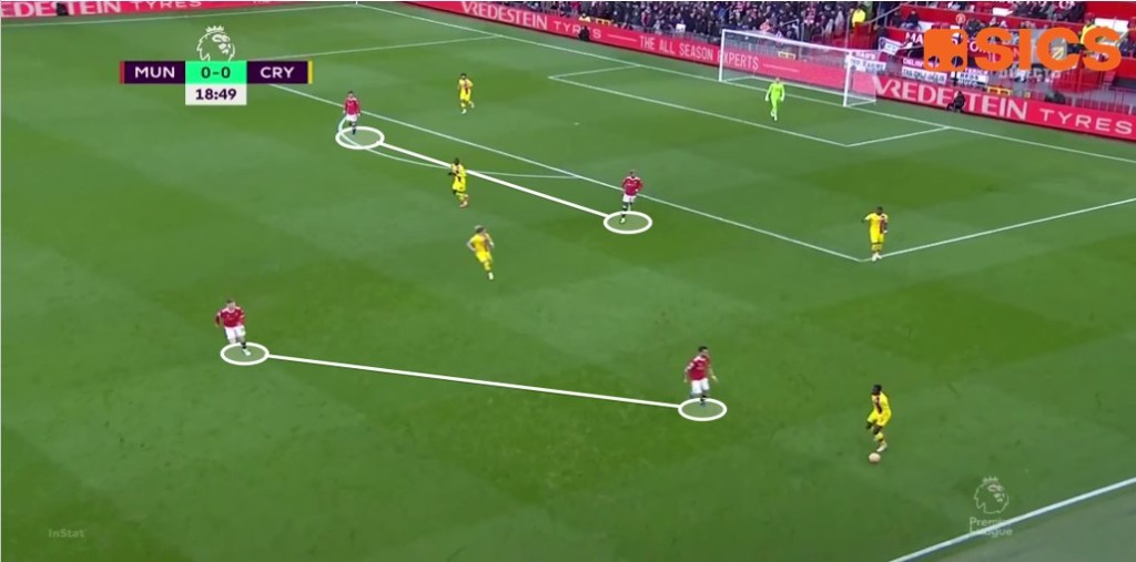 Questo atteggiamento, oltre ad essere un modo diverso di difendere rispetto a quanto visto con Solskjaer (con lo United che preferiva difendersi in un blocco medio-basso poco aggressivo) rappresenta anche un’alternativa rispetto ad un pressing più orientato sull’uomo, come siamo abituati a vedere ad esempio in Italia.