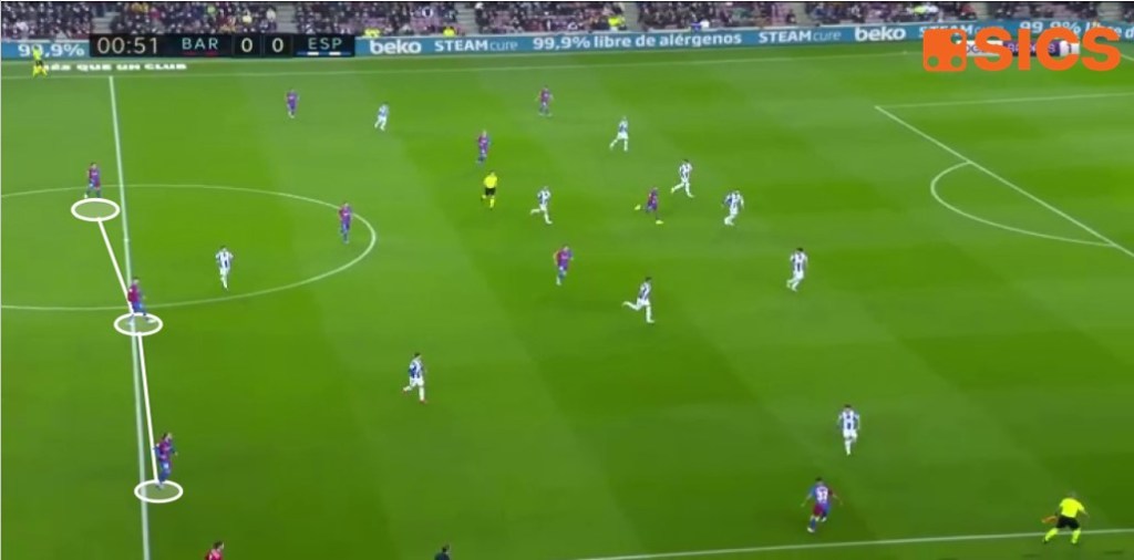 Dal punto di vista tattico il tecnico catalano è partito mostrando come sistema base un 4-3-3 che va poi a svilupparsi 3-2-5. In fase di costruzione la squadra cerca fin da subito di trovare l’uscita migliore dalla prima pressione avversaria attraverso il fraseggio ma senza disdegnare la palla diretta da ter Stegen verso Depay.