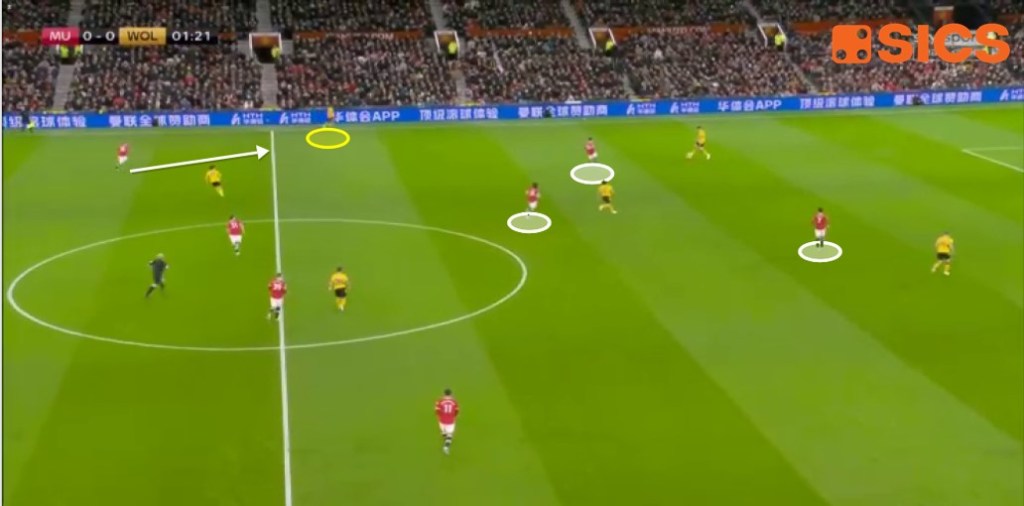 Non a caso, il Wolverhampton è riuscito agevolmente a costruire da dietro, superando la prima pressione dello United. In fase offensiva inoltre Bruno Lange ha individuato uno dei punti deboli di questo Manchester.