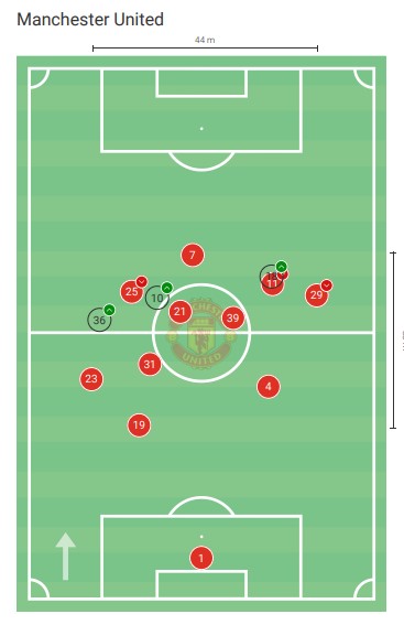 Per ovviare a questa situazione, nel secondo tempo lo United è passato ad un sistema con tre difensori centrali e due esterni. Un cambiamento che non ha avuto impatto sul risultato finale anche se ha permesso alla squadra di Rangnick di riassestarsi (‹‹abbiamo avuto più controllo›› ha detto il tedesco). Di certo questa modifica del sistema base ha confermato le difficoltà che il Manchester ha in questo momento nell’essere efficace col 4-2-2-2.