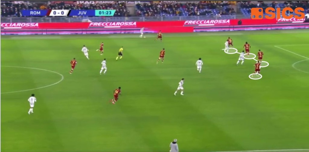 Contro la Juve si è vista, almeno inizialmente, una eccezione a questa tendenza, con i giallorossi che sono partiti bene mettendo pressione al possesso juventino e costringendo la squadra di Allegri e Landucci a forzare le verticalizzazioni per superare le linee difensive romaniste.