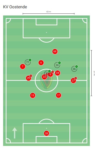 Dal punto di vista difensivo, proprio per la sua formazione con la Red Bull (comune ad allenatori come Marco Rose, Jesse Marsch e Julian Nagelsmann), non deve soprendere l’intensità di pressing portata dalla squadra di Blessin. L’indice PPDA dell’Ostenda (8.38) è il quarto più basso nel campionato belga.
