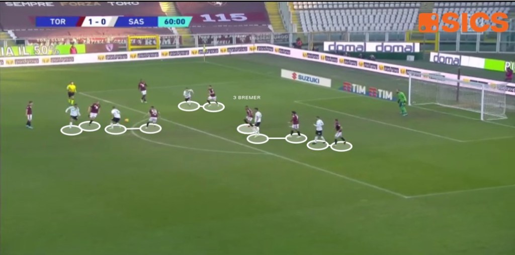 In un sistema di marcature (molto aggressive) a uomo nella zona, dove si difende in avanti per cercare di allontanare il pericolo più che per andare all’immediata riconquista, Bremer si sta quindi esaltando.