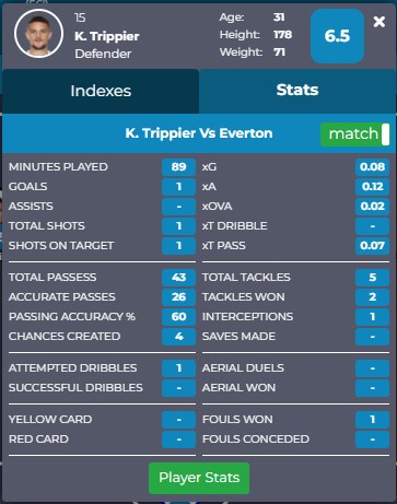 Trippier, oltre a segnare un gol, ha giocato 76 palloni (il maggior numero per la sua squadra) effettuando 43 passaggi con una precisione del 60%. L’ex Atlético Madrid ha quindi confermato in questa partita le sue qualità in fase offensiva, sia sui calci piazzati che a supporto della manovra in fase di possesso.