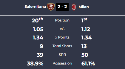 Il risultato finale di questa strategia (al di là dei due gol effettivamente subiti) è stato quello di ridurre a 1.12 il dato degli expected goals (xG) prodotti da un Milan che, fino alla sfida dell’Arechi, viaggiava ad una media di 1.67 xG a partita.