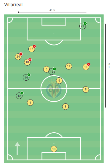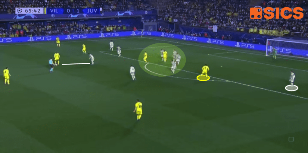 In base a quanto visto prima in partita e durante l’intera gestione dell’Allegri II con la Juve, l’idea che ne possiamo trarre è quella di un sistema difensivo a uomo nella zona. In questo senso si spiegano gli accoppiamenti più di frequente visti in campo durante la sfida dell’Estadio de la Cerámica, con Vlahović a ballare fra i due difensori centrali dei gialli; Cuadrado su Pedraza a sinistra e De Sciglio su Chkwueze a destra; McKennie, Locatelli e Rabiot contro Alberto Moreno, Parejo e Capoue; e con i tre centrali difensivi ad occuparsi di Lo Celso e Danjuma.