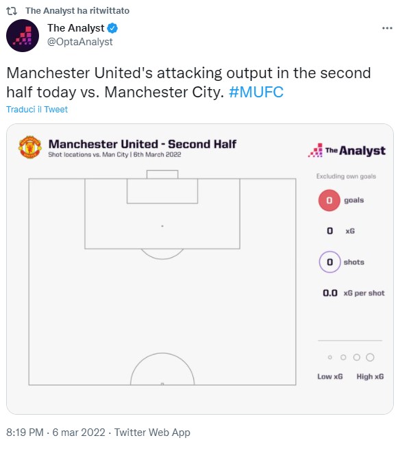 Più che gli errori difensivi che hanno portato alle altre due segnature della squadra di Guardiola, a lasciare impressionati (in negativo) è stata la totale incapacità della formazione di Rangnick di opporre una pur minima reazione. Tanto è vero che gli ospiti hanno chiuso i secondi quarantacinque minuti di gioco non riuscendo a produrre nessun dato in termini di expected goals.
