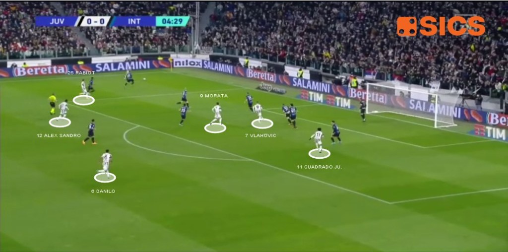 La struttura offensiva della Juventus (3-1) ed il sopracitato atteggiamento attivo hanno aiutato il non possesso bianconero nell’attuare un pressing che alla fine ha disarticolato il palleggio interista.