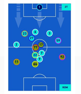 Al Napoli non restava che affidarsi alle palle in profondità per Osimhen mentre Mourinho inseriva altri elementi offensivi a sua disposizione (El Shaarawy al posto di Zalewski e Carles Pérez per Mancini) forzando ulteriormente la difesa posizionale del Napoli.