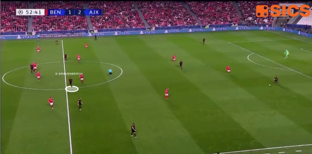 In possesso ad esempio Gravenberch si alzava spesso trovandosi ad agire più o meno sulla stessa linea del trequarti Berghuis, agendo nel mezzo spazio sinistro e finendo così per dividere col compagno la zona di rifinitura centrale.