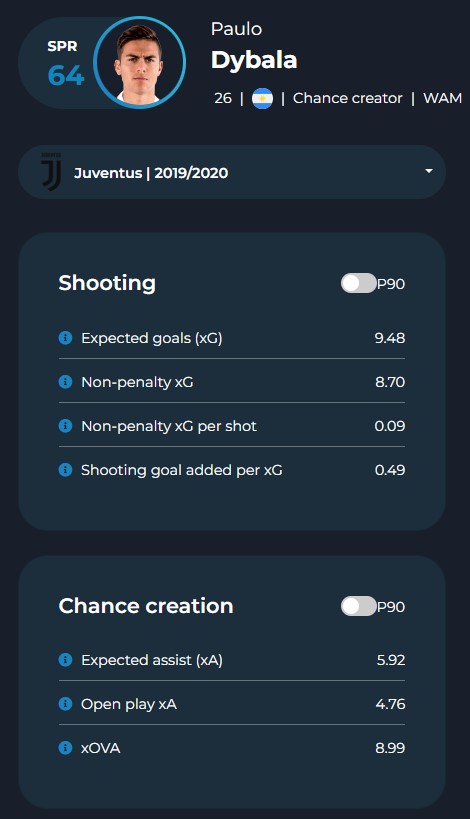 Le ultime tre stagioni quindi, pur nella loro diversità, ci lasciano un Dybala che ha confermato la sua tendenza a galleggiare nel mezzo spazio destro in rifinitura (28.9 p/90 tocchi nella trequarti offensiva in questa stagione) ma che ha altresì dato prova di poter essere letale se avvicinato alla porta avversaria. La sua shooting goal added (cioè l’incremento aggiunto da Dybala con i suoi tiri al valore degli xG) è stata di 4.13 (fra i primi 15 giocatori della massima serie).