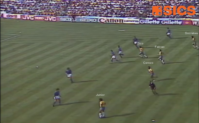 Il Brasile ‘82 invece riproponeva quella fluidità di sistema tipica del modo di giocare brasiliano, fatta di occupazione degli spazi in funzione della posizione della palla e dei compagni, di costruzione di triangoli di passaggio e di un ritmo controllato del possesso al quale dare seguito con improvvise e tecnicamente efficacissime accelerazioni in verticale.