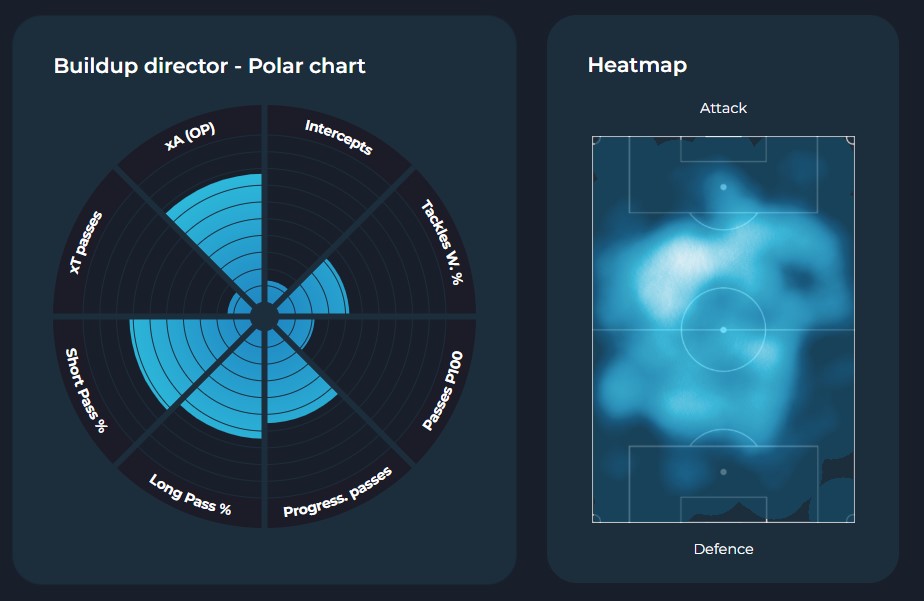 L’ex sampdoriano è buildup director che può ricoprire tutte e tre le posizioni centrali (oltre a poter agire anche da eventuale no.10 in zona di rifinitura), aiutando la squadra sia in fase di uscita palla da dietro che di consolidamento del possesso.