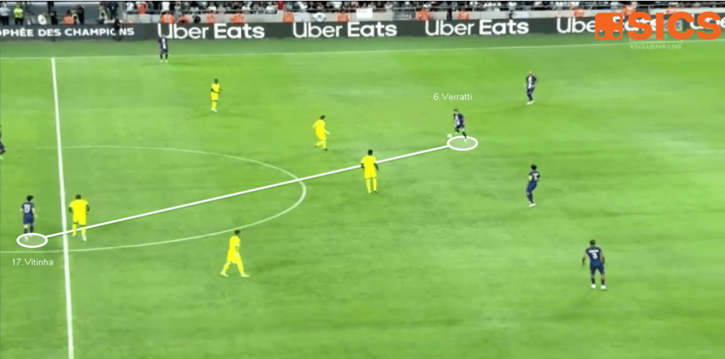 In verticale, più avanzato di Verratti, ha agito Vitinha. Il neoacquisto portoghese ha svolto col Nantes le funzioni di mediano avanzato, che aveva il compito di aiutare la squadra nel collegare la zona di costruzione a quella di rifinitura. In quest’ultima zona del campo hanno agito poi Messi e Neymar. In attesa dell’inserimento di Mbappé, l’idea sembra quindi quella di dotare la squadra di una base 3+4 alla quale poi aggiungere i tre tenori, disposti in base alle esigenze del momento.
