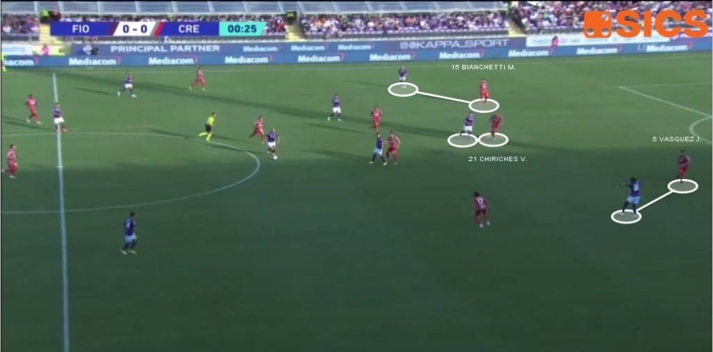 Col centro del campo bloccato dall’aggressività e dalla densità generata dalla Cremonese, la Fiorentina ha come detto veicolato il gioco soprattutto esternamente. Questo è avvenuto in particolar modo a sinistra, dove agiva la catena composta da Biraghi, Maleh e Sottil.