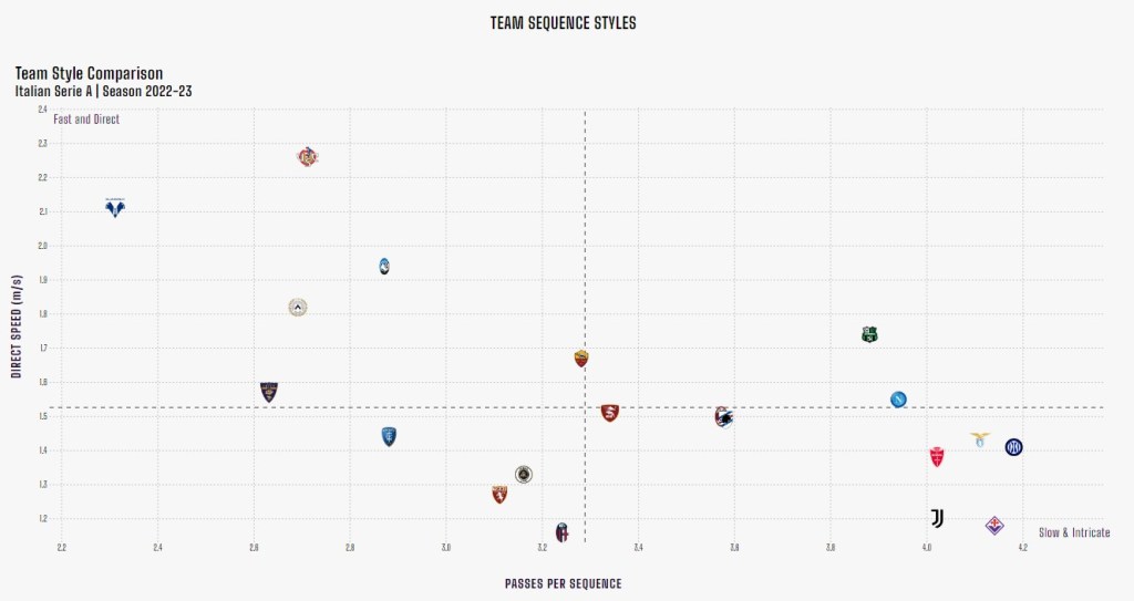 Per quanto riguarda la Cremo, i lombardi con Alvini sono passati da un sistema più orientato sul controllo della palla e sulla copertura delle linee di passaggio avversarie ad uno che estremizza l’1c1 e la verticalità (i grigiorossi sono la squadra più diretta della serie maggiore con una velocità di risalita del campo di 2.29 m/sec.). In queste prime giornate, oltre ad un calendario difficile (forse col solo Torino si poteva parlare di sfida accessibile, mentre le partite contro Fiorentina, Roma e Inter erano oggettivamente fuori portata in questo momento del campionato) la compagine grigiorossa ha pagato ovviamente il fatto che il gruppo sia quasi totalmente nuovo rispetto allo scorso anno e che, come detto, sia appena all’inizio nella strada che porta all’acquisizione di nuove conoscenze tattiche.